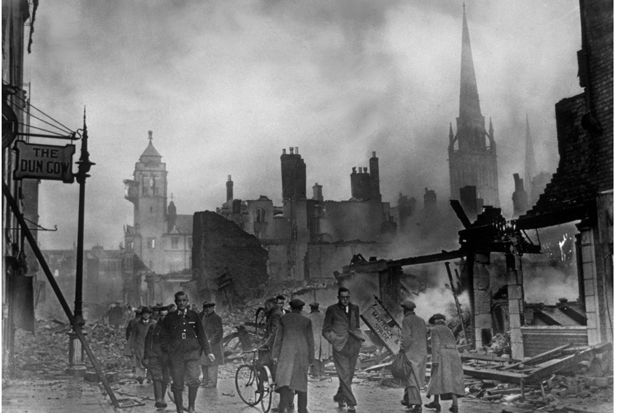 In the space of 11 hours, buildings and people were torn apart, crushed and suffocated. Three quarters of Coventry’s plane and automobile plants were obliterated; the medieval cathedral was left a hacked-out ruin billowing smoke. Few could endure more blackout, bombs and sirens. (The stench of burned buildings, compact of blackened masonry, dust and pitch, was bad enough.) So everyone who coul left — on lorries, on foot — to stay with friends and family further afield.