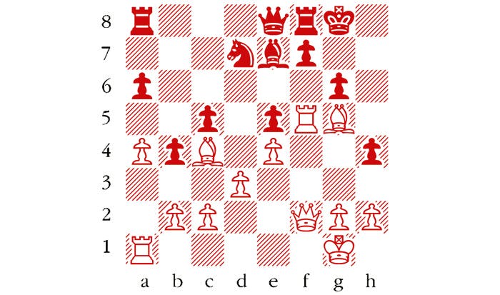 White to play. This is from Keres-Mardle, Hastings 1964. How did Keres ignite his attack? Answers to me at The Spectator by Tuesday 2 February or via email to victoria@spectator.co.uk or by fax on 020 7681 3773. There is a prize of £20 for the first correct answer out of a hat. Please include a postal address and allow six weeks for prize delivery.