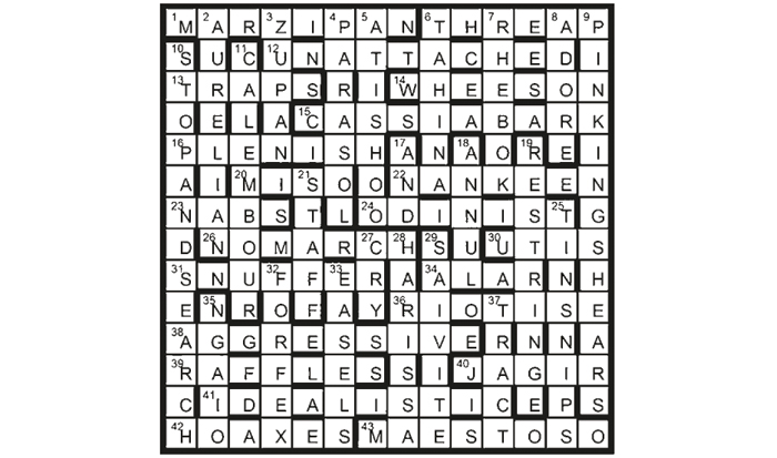 The thematic term (formed by letters cut from definitions, 17, and letters added to definitions) is SCISSORS-AND-PASTE. Unclued lights are types of scissors (9, 25, 31, 32) and paste (1, 6D, 20, 28).