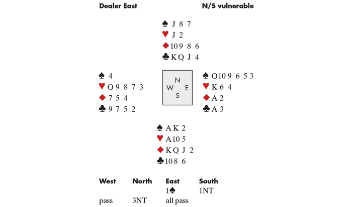 My partner led the 7 to my K. It’s tempting for declarer to take this trick: by winning, she is guaranteed another heart trick; by ducking she gives it up. Moreover, if hearts are 4–4, she goes down by ducking. But Lou decided the 7 looked suspiciously like it was led from Qxxxx; and my opening bid marked me with both minor-suit aces. So she held up her A, and when I continued, held up again. She won the third heart, played the K and on winning I was powerless; I returned a diamond; she won, knocked out the ♣A and quickly wrapped up nine tricks.