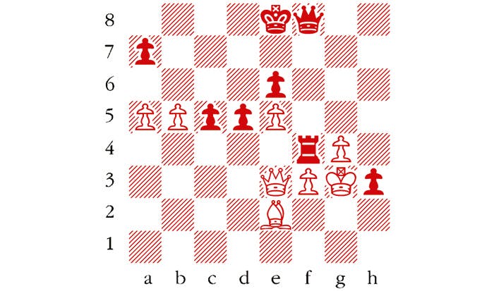 Black to play. This position is from Shirov-Nakamura, Zurich 2016. Black is winning easily but now finished with a fine geometrical concept. What was the key move? Answers to me at The Spectator by Tuesday 1 March or via email to victoria@spectator.co.uk or by fax on 020 7681 3773. There is a prize of £20 for the first correct answer out of a hat. Please include a postal address and allow six weeks for prize delivery.