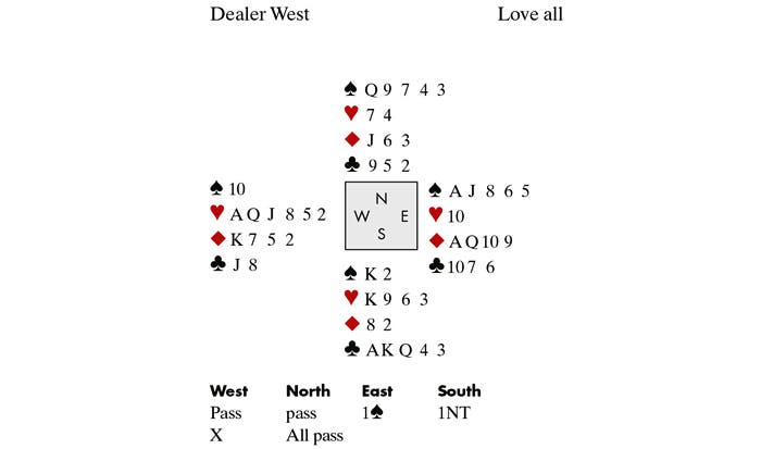 Mark was sitting South. His 1NT overcall is a fair shot at pairs, but after it got doubled most of us would run to 2♣, but most of us don’t have Mark’s chutzpah. You don’t win pairs events by chickening out. He passed and West led the ♥Q round to declarer’s King.