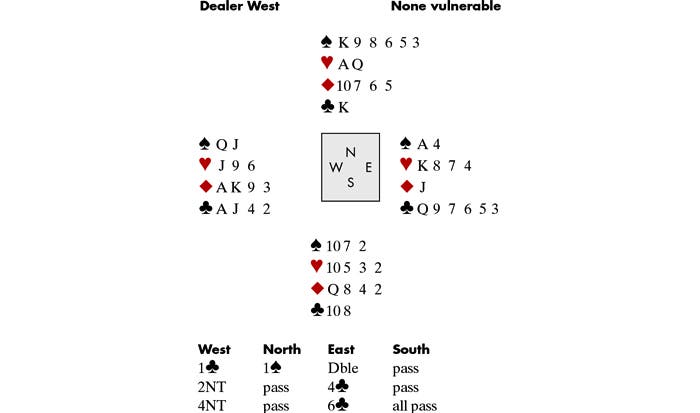 North led the ♦5 to the jack, queen and king. Zimmerman paused to think. South had not raised spades so it was unlikely he held four. North, presumably holding six, had made a simple overcall rather than a weak jump, suggesting he had a reasonable hand. Moreover, if South held the ♣K that would give him 5 points and with three-card spade support he might have raised to 2♠. Zimmerman made up his mind: he continued with the ♠Q, which held, then ruffed a diamond and played the ♣Q (just in case), putting up the ♣A and felling North’s ♣K. With a silent nod to the Rabbi, he drew the last trump, cashed the ♦A, and when the ♦10 didn’t fall had to hope North had precisely ♥AQ — bingo!