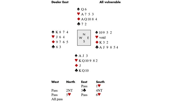 West led the ♣6 to the Ace, and declarer won the return with his King, relieved that West followed. The King of Hearts revealed the 3–0 break — annoying as South was about to claim, throwing dummy’s Spade on his high Club and ruffing two Spades in dummy. Now he had to find one more trick. Should he finesse in Spades or guess which way to take the Diamond finesse? East should have one of the kings for his bid, but hardly both — or he would have opened the bidding. Declarer drew three rounds of trumps, ending in dummy, and called for the ♠Q. When East didn’t cover, South went up with the Ace and took the ruffing finesse in Diamonds for his twelfth trick. Simple but neat.