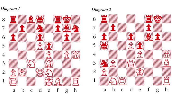 1 d4 Nf6 2 c4 g6 3 Nc3 Bg7 4 e4 d6 5 f3 0–0 6 Be3 e5 7 Nge2 c6 8 d5 cxd5 9 cxd5 a6 10 Qd2 Nbd7 11 g4 h5 12 h3 Nh7 13 h4 This move constitutes a serious inaccuracy. White should play either 13 Rg1 or 13 0‑0‑0. 13 … hxg4 14 fxg4 (see diagram 1) 14 … Nhf6 Gligoric missed a promising opportunity with 14 … Nb6! when Black threatens … Bxg4 and also … Nc4 when White has only unpleasant options. 15 Bh3 Nb6 16 Bg5 Nc4 17 Qd3 Qc7 17 … Nxb2? allows White to greatly increase pressure on f6 e.g. 18 Qf3! b5 19 h5! with a strong attack. 18 b3 Na3 19 Rc1 Bxg4 Gligoric’s move walks into Tal’s devious trap, but his position is already precarious. 20 Bxf6 Bxe2 21 Kxe2 Bxf6 22 Nb1 Qa5 (see diagram 2) 23 b4 This clearance/double attack shot wins Black’s knight. 23 … Qxb4 24 Nxa3 Bxh4 Black gets three pawns for the piece which is not so bad. His trouble comes not from material considerations, but from a lack of king safety. 25 Nc4 b5 26 Nb6 Rad8 27 Bf5 Bg5 28 Rcg1 Qb2+ 29 Kf3 Bf4 30 Rg2 Qb4 31 Nd7 Rc8 32 Nf6+ This wins, but immediately decisive is 32 Bxg6 fxg6 (32 … Rc3?? is refuted by 33 Bf5+ Bg3 34 Rxg3 mate) 33 Rxg6+ Kf7 34 Rf6+ Kg7 35 Rg1+ Kh8 36 Rxf8+ Rxf8 37 Nxf8. 32 … Kg7 33 Nh5+ Kg8 34 Bxc8 Rxc8 35 Rc2 Rxc2 36 Qxc2 Qa3+ 37 Qb3 Qxb3+ 38 axb3 gxh5 39 Ra1 h4 40 Kg4 Be3 41 Rxa6 Bc5 42 Kxh4 f5 43 exf5 e4 44 b4 Bxb4 45 Kg5 Kf7 46 Ra7+ Ke8 47 f6 Black resigns