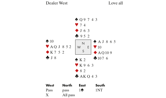 Mark was sitting South. His 1NT overcall is a fair shot at pairs, but after it got doubled most of us would run to 2♣, but most of us don’t have Mark’s chutzpah. You don’t win pairs events by chickening out. He passed and West led the ♥Q round to declarer’s King.