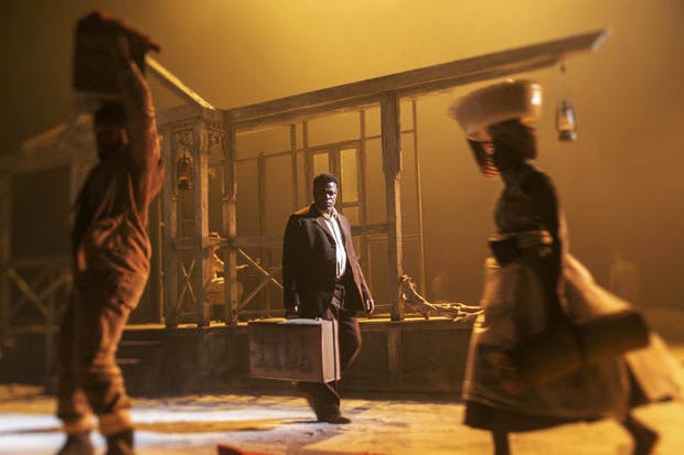 The setting is a nameless African colony populated by do-gooding Europeans, angry freedom fighters and a thuggish soldiery overseen by a British army major who happens to be a psychopathic racist. The atmosphere of the tropics is conjured brilliantly and Soutra Gilmour’s lavish designs are a true feast for the eye. There’s music, too, from white-gowned matriarchs who warble native choruses and pluck away at crude, hand-made instruments. Stock-still peasants watch the action with pots on their heads. Just occasionally I felt I was watching an arts-and-crafts display at the Commonwealth Institute but the show earns good marks for making the Olivier’s space work well.