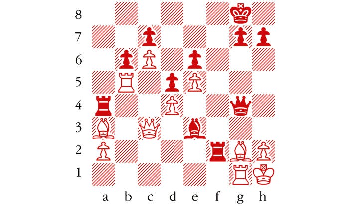 Black to play. This is a position from Carbone–Slipak, Mar del Plata 2016. How can Black conclude? Answers to me at The Spectator by Tuesday 19 April or via email to victoria@spectator.co.uk or by fax on 020 7681 3773. There is a prize of £20 for the first correct answer out of a hat. Please include a postal address and allow six weeks for prize delivery.