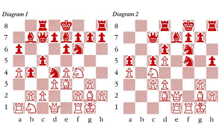 1 e4 e6 2 Qe2 This unusual move was a Chigorin speciality and, essentially, leads to positions similar to the modern King’s Indian Attack. 2 … c5 3 g3 Nc6 4 Bg2 Be7 5 Nc3 Qc7 6 Nh3 a6 7 Nf4 Nd4 8 Qd1 Nf6 9 d3 b5 10 0-0 Bb7 11 Be3 Rc8 12 a4 b4 13 Nb1 (see diagram 1) 13 … e5 This is a strategic mistake as now White gains control of the d5- and c4-squares. Much better is 13 … 0-0 intending 14 Nd2 d5 with an equal position. 14 Nd5 Bxd5 15 exd5 Qd6 16 Nd2 If Black now takes the d5-pawn with 16 … Nxd5 there follows: 17 Nc4 Qe6 18 Bxd4 cxd4 19 Bxd5 Qxd5 20 Nb6 and White wins the exchange. 16 … Qc7 17 Nc4 h5 A desperate attempt to attack. 18 f4 Nf5 19 Bd2 exf4 20 Bxf4 d6 21 Qe2 Rd8 22 Rae1 Kf8 If 22 … 0-0 then 23 Bg5 wins a piece. 23 c3 a5 24 Bd2 bxc3 25 bxc3 (see diagram 2) 25 … Nh6 If 25 … g6 26 Bh3 Ng4 27 Bxg4 hxg4 28 Nxa5 Qxa5 29 Rxf5 gxf5 30 Qxe7+ Kg8 31 Qg5+ winning. 26 Nxa5 Nhg8 27 Nc6 Re8 28 c4 Qd7 29 Bf4 h4 30 g4 Nxg4 30 … Qxg4 31 Qxg4 Nxg4 32 Nxe7 Nxe7 33 Bxd6 wins easily. 31 Bh3 N8f6 32 Bg5 Rh5 33 Bxf6 gxf6 34 Qxg4 Black resigns