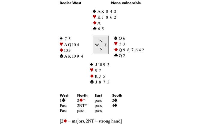 West led a spade. David rose with dummy’s ♠A, and continued with the♠K. Next he cashed the ♦A, crossed to hand with a trump, and played the uK, pitching a club. He then led a heart to dummy’s ♥K, which held, and a heart back towards his ♥9. West won with the ♥10 and now made a tiny but understandable error: he cashed the ♣A before switching to a low club. David ruffed, and continued with the ♥J, discarding his last diamond from hand. West was caught in a very unusual end-play. His last three cards were ♥A ♣K10. Declarer held ♠10 ♣J8 and dummy held ♠8 ♥86. If West played the ♥A, David could ruff in hand, ruff a club in dummy and cash his winning ♥8. If West played the ♣K, David could ruff in dummy, ruff a heart in hand, and cash his winning ♣J.