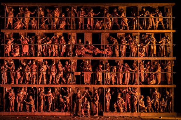 I realised how wise Stravinsky was to write his Oedipus drama to a Latin text, and to call it an ‘opera-oratorio’, though in fact it is far more dramatic than Enescu’s opera, to which the term would be much more appropriate. I don’t want to sound negative: I wasn’t bored for a moment in this medium-sized work, and the superb choral writing, done full justice to by a chorus who had to spend most of the time pretending to be the Terracotta Army — the first sight of the four-tiered set, with all those baked figures, is unforgettable — provided the same kind of thrill that you can get from a superior biblical epic.