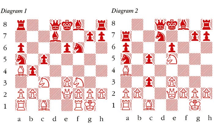1 d4 d5 2 c4 dxc4 3 Nf3 Nf6 4 e3 e6 5 Bxc4 c5 6 0-0 Nc6 7 Qe2 a6 Black is mixing systems. 6 … a6 is the main line, whereas combining it with an early … Nc6 creates a few problems for him. 8 Nc3 b5 9 Bb3 b4 This is the move which brings the roof down on Black’s head, although things are already not that easy for him. 10 d5 Na5 Relatively best. The alternatives are worse, for instance 10 … exd5 11 Nxd5 Nxd5 12 Rd1 Qc7 13 Bxd5 leaves Black in serious trouble, as he cannot complete his development satisfactorily. 11 Ba4+ Bd7 12 dxe6 fxe6 (see diagram 1) 13 Rd1 A typical Alekhine piece sacrifice. 13 … bxc3 14 Rxd7 Nxd7 15 Ne5 Ra7 (see diagram 2) 16 bxc3 This quiet recapture is a remarkable move. 16 Qh5+ was the obvious continuation when 16 … g6 17 Nxg6 hxg6, when White can obtain a draw by repetition with 18 Qxg6+ Ke7 19 e4 Bh6! (the only satisfactory defence to the threat of Bg5+) 20 Bxh6 Qg8 21 Bg5+ Kf8 22 Bh6+ Ke7 23 Bg5+ Kf8 etc. 16 … Ke7 This is the critical point of the game. This move, trying to escape the pin on the d7-knight, is bad. The obvious and natural move is 16 … g6 with unclear play. 17 e4 Threatening 18 Bxd7 Rxd7 19 Bg5+. 17 … Nf6 18 Bg5 Qc7 19 Bf4 Qb6 20 Rd1 g6 This stops a subsequent Qh5 and also attempts to develop the kingside, but now the weakness of the f6-knight is fatal. 21 Bg5 Bg7 22 Nd7 Rxd7 Or 22 … Qc7 23 e5, winning easily. 23 Rxd7+ Kf8 24 Bxf6 Bxf6 25 e5 Black resigns If the bishop moves, there is a deadly check on f3.