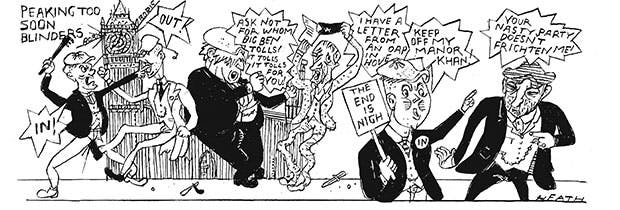 In the Queen’s Speech, the government made provision for bills against extremism and in favour of driverless cars, drones, commercial space travel and adoption. It proposed turning all prisons into academies or something similar and consolidating British rights while reducing the power of the House of Lords. The watchword was ‘life chances’. Boris Johnson MP said that the EU was an attempt to recover the continent’s lost ‘golden age’, under the Romans: ‘Napoleon, Hitler, various people tried this out, and it ends tragically.’ For his part, David Cameron, the Prime Minister, said that in the event of Britain leaving the EU, ‘Putin would be happy. I suspect al-Baghdadi [leader of the Islamic State] would be happy.’ Nigel Farage, leader of the UK Independence party, said that if the Remain side won a narrow victory in the referendum there would have to be another one. Brighton council took out of service a dustcart painted with the Union flag lest it be mistaken for a Brexit ‘battlebus’.