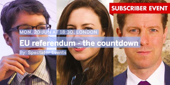 Will Britain vote to leave the EU? Can the Tories survive the aftermath? Join James Forsyth, Isabel Hardman and Fraser Nelson to discuss at a subscriber-only event at the Royal Institution, Mayfair, on Monday 20 June. Tickets are on sale now. Not a subscriber? Click here to join us, from just £1 a week.