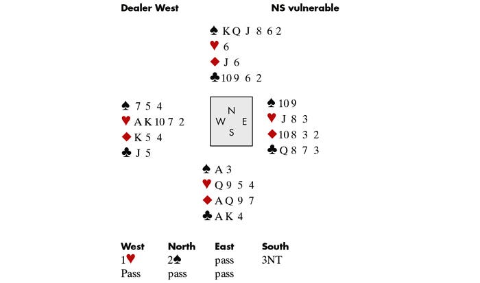 West led the ♥A followed by a low heart to East’s ♥J and Sally’s ♥Q (a club thrown from dummy). She had ten tricks. It seemed likely that West held the ♦K and would come under pressure on the run of the spades. Sally cashed the ♠A, crossed to the ♠K, and ran the rest of her spades, watching West’s discards carefully. On the final spade, Sally was down to ♥9, ♦AQ, ♣AK4, and made the important discard of a club rather than the ♥9. Poor West: she was down to ♥K102, ♦K5, ♣J. She couldn’t discard her ♣J, as then declarer could run the ♣10 for an 11th trick. Baring the ♦K was possible but Sally had a good count of the hand and wouldn’t have fallen for that. So West discarded a heart. When Sally crossed to hand and cashed the ♣AK, West was pincered. She came down to ♥K, ♦K5 and was, of course, thrown in with Sally’s ♥9 to play a diamond.