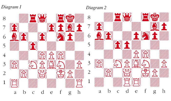 1 e4 g6 2 d4 Bg7 3 Nc3 d6 4 f4 Nf6 5 Nf3 0-0 6 Bd3 Nc6 In his book, Nigel Davies gives preference to the more modern try 6 … Na6, preparing the advance … c5. 7 h3 The drawback to this is the loss of time involved, which enables Black to inaugurate a swift queenside counter-attack. 7 … Nb4 8 Be3 b6 In order to support … c7-c5, but also clearing a path to a6 for the black queen’s bishop. 9 a3 Nxd3+ 10 cxd3 c5 11 Qd2 Ba6 12 Kf2 Rc8 (see diagram 1) If now 13 Rag1 then 13 … c4! 14 dxc4 Rxc4 threatening … Rxc3 and … Qa8 when White’s ‘centre’ folds up in mid-board. 13 Rhc1 Nd7 14 d5 e6 15 dxe6 fxe6 16 Re1 White’s position is becoming critical. Now, or on the next move, he had to play Kg1. 16 … Nf6 17 Rad1 d5 (see diagram 2) This wins by force. White carries on meeting each direct threat, until his resources are no longer sufficient to cope. 18 exd5 exd5 19 d4 Ne4+ 20 Nxe4 dxe4 21 Ne5 g5 The final shattering blow which completes the demolition of White’s centre. As a side note it is worth mentioning the rather pleasing geometrical effect created by this position, which would be enhanced if Black’s king’s bishop were at h6. 22 Kg1 gxf4 23 Bxf4 Qxd4+ 24 Qxd4 cxd4 25 g3 Rfe8 In regaining his pawn White gets into a fearful tangle. 26 Rxe4 Rc5 27 Rde1 d3 28 Nf3 Rxe4 29 Rxe4 Bb7 30 Re3 d2 31 Nxd2 Bd4 32 Kf1 Ba6+ 33 Kg2 Bxe3 34 Bxe3 Rc2 35 b3 Bb7+ 36 Kf1 Bd5 37 Ke1 Bxb3 White resigns