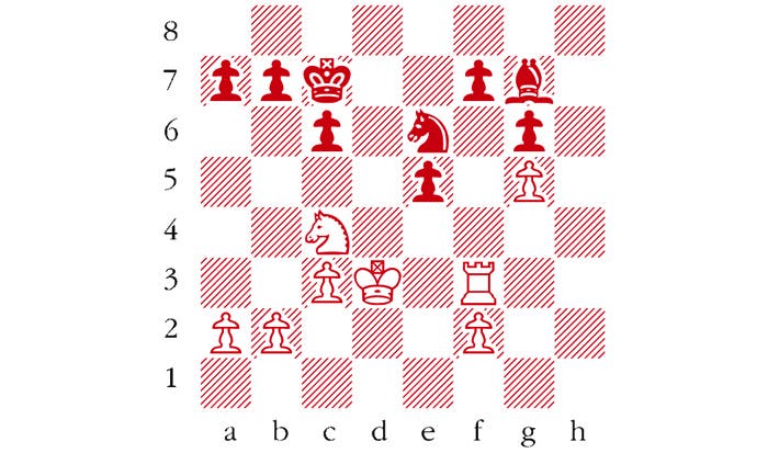 Black to play. This is from Cherin-Pedini, Italy 2016. Black has just sacrificed some material as he could foresee a simplifying manoeuvre leading to a winning ending. How did he continue? Answers to me at The Spectator by Tuesday 7 June or via email to victoria@spectator.co.uk or by fax on 020 7681 3773. There is a prize of £20 for the first correct answer out of a hat. Please include a postal address and allow six weeks for prize delivery.