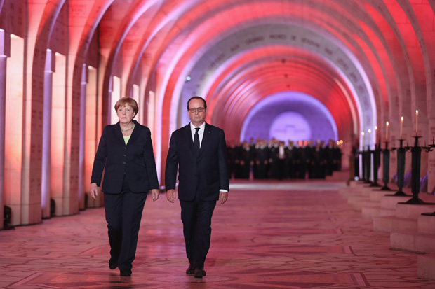 Mrs Merkel and President Hollande stood together at Verdun to symbolise their countries’ reconciliation. In 1984, their predecessors, Kohl and Mitterrand, did so hand-in-hand. Most people considered this very moving. A friend of mine privately asked Margaret Thatcher if she did not think so too. ‘No, I did not,’ she exclaimed, ‘Two grown men holding hands!’ I have recently heard that the Kohl/Mitterrand gesture arose because the two men were stranded on the field of commemoration with no interpreters. Unable to talk to one another, they resorted to body language instead. It turned out more eloquent than words.
