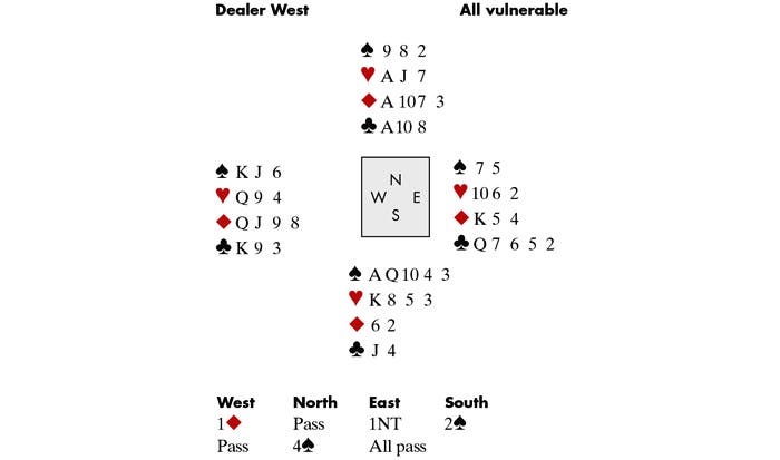 West kicked off with the ♦Q, allowed to hold. The next Diamond was won in dummy, and a Diamond ruffed in hand.