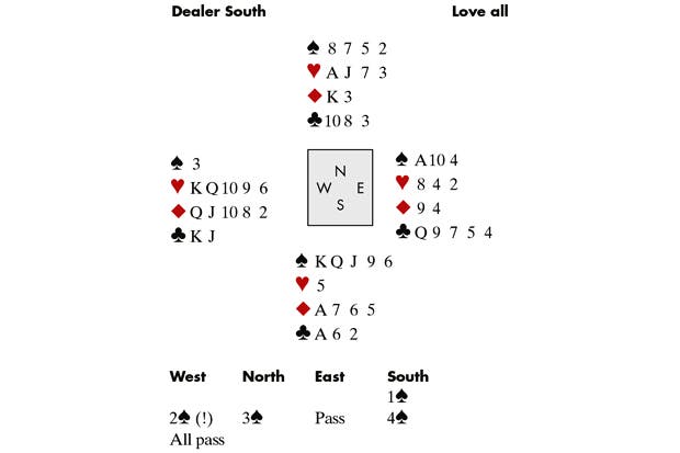 West led the ♦ Queen. Declarer only has three losers, two Clubs and the Ace of Spades, but the bidding and lead almost guarantee that West is 5–5 in the red suits, and East will be able to over-ruff dummy. What to do? Bessis won the lead in dummy, cashed the Ace of Hearts and played another Diamond to his Ace. He then played a third Diamond and discarded a Club from dummy, as East threw a Heart. West shifted to a trump, and East played Ace and another. Thomas won in hand, played his last Diamond and threw dummy’s last Club. Whatever West did, Declarer could now ruff his two Club losers in dummy and make his game. Beautiful!