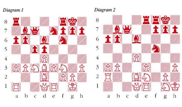 1 d4 e6 2 c4 d5 3 e3 c5 4 Nc3 Nf6 5 Nf3 Nc6 6 Bd3 a6 7 0-0 Bd6 8 a3 b6 Staunton employs the fianchetto – an idea with which the Frenchman was clearly unfamiliar. 9 Re1 0-0 10 h3 White seems to be at loss for a plan. 10 … Qc7 11 b3 Ne7 Preparing … Bb7 to take control of e4. 12 Bd2 This is very feeble. 12 Bb2 was more to the point. 12 … Bb7 13 cxd5 exd5 (see diagram 1) Black can now look forward to eventual occupation of e4. 14 Kh1 White is drifting. This weak move deprives the e-pawn of protection. 14 … Rae8 Staunton masses his forces to bring them into contact with the e4-square. 15 Ra2 After this artificial move, White’s game crumples. 15 … Ne4 16 Bxe4 dxe4 17 Ng1 cxd4 18 exd4 Nf5 The black forces burst into life. 19 Nce2 e3 20 fxe3 (see diagram 2) 20 … Rxe3! The rook is immune. If 21 Bxe3 Nxe3 threatens mate and the queen. 21 Qc1 Qxc1 There is nothing wrong with this but 21 … Bxg2+ 22 Kxg2 Qb7+ 23 Kf1 Rfe8 was winning immediately. 22 Rxc1 Rxb3 23 Rc3 Rxc3 24 Bxc3 Nh4 Black has an overwhelming position in the endgame. 25 Nf3 Nxf3 26 gxf3 Bxf3+ 27 Kg1 Re8 28 Kf2 Bxe2 29 Rxe2 Rxe2+ 30 Kxe2 Bxa3 31 Kd3 f6 32 Ke4 b5 33 Kd5 b4 White resigns