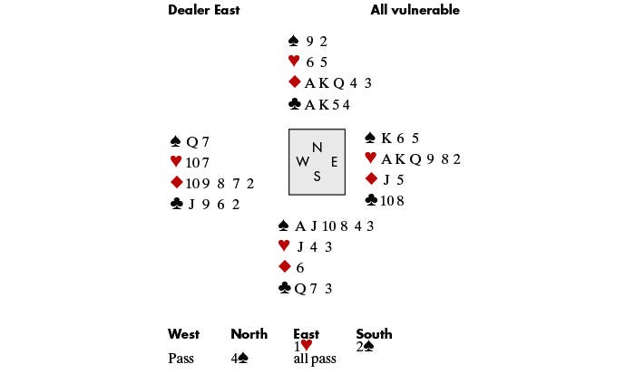 West led the ♥10 and East played off the top three Hearts. If, on the third round of hearts, West pumps up with the ♠Q, declarer will discard from dummy, finesse East’s ♠K, and make his contract. If, on the other hand, West rises to the occasion and discards (say) a diamond, South will ruff in dummy and thereafter have to lose two trump tricks and his contract.
