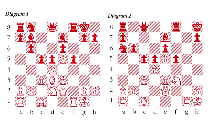 1 d4 Nf6 2 Nf3 e6 3 e3 d5 4 Bd3 Be7 5 Nbd2 0-0 6 0-0 b6 This is the Colle versus the Queen’s Indian, but with Black’s d-pawn committed to d5. This is a factor which favours White, since it becomes a lot easier to launch an attack on Black’s king with a quick Ne5. 7 Ne5 Nfd7 This move may be unnatural, but it serves an important purpose: if Black plays … f5, as a counter to White’s coming f4, his king will be a lot safer. The obvious issue is that it isn’t a developing move. 8 f4 f5 9 Qe2 Nxe5 10 fxe5 c5 11 c3 Bb7 (see diagram 1) 12 g4 It’s time to shift into wrecking ball mode. When Black plays … f5 against the reversed Stonewall structure, then g4 becomes the natural break. 12 … g6 12 … fxg4?! 13 Qxg4 allows White’s queen into the attack for free. 13 gxf5 gxf5 14 Kh1 Kh8 15 Nf3 Qc8 This idea to swap off Black’s bad bishop via a6 looks awfully slow, since it distracts Black’s queen from the defence of her king. 16 Rg1 Ba6 17 Bxa6 Nxa6 (see diagram 2) 18 e4!! A brilliant line-opening/pawn sacrifice. The move allows White’s entire formally dormant queenside pieces into the attack. 18 … dxe4 If 18 … fxe4 19 Bh6! Rg8 (19 … Rxf3 20 Qg2! and Black is mated) 20 Rxg8+ Qxg8 21 Rg1 with a winning attack. 19 Bh6 Rg8 20 Rxg8+ Qxg8 21 Rg1 exf3 Desperation. 21 … Qf7 fails to 22 Ng5 Qg6 23 Qxa6 and White’s bishop is immune, due to the knight fork on f7. 22 Qxf3 Black’s queen isn’t running away. 22 … Qxg1+ 22 … Qe8?? 23 Qg2! leaves Black curiously helpless to prevent mate, since Black’s queen is unable to play to g6, since then the a8-rook hangs. 23 Kxg1 Rg8+ 24 Kf1 Nc7 25 Qc6 The queen enters a target-rich environment. 25 … Bd8 26 dxc5 b5 27 Qd7 a6 28 Bg7+ Black resigns White wins a piece after 28 … Rxg7 29 Qxd8+ Rg8 30 Qxc7.