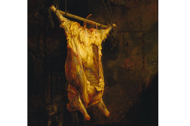 Rembrandt’s ‘Slaughtered Ox’ was the inspiration for Francis Bacon’s famous ‘Figure with Meat’ in the Art Institute of Chicago, in which Velázquez’s ‘Pope Innocent X’ is sandwiched between two sides of beef. For the carnal Bacon, meat was the ultimate memento mori: ‘Of course, we are meat, we are potential carcasses,’ he said in 1965. ‘If I go into a butcher’s shop I always think it’s surprising that I wasn’t there instead of the animal.’ That was the year he painted the picture on show here of ‘Henrietta Moraes on a Blue Couch’, posed like a scrap of pork belly in a yawning hippo’s mouth.