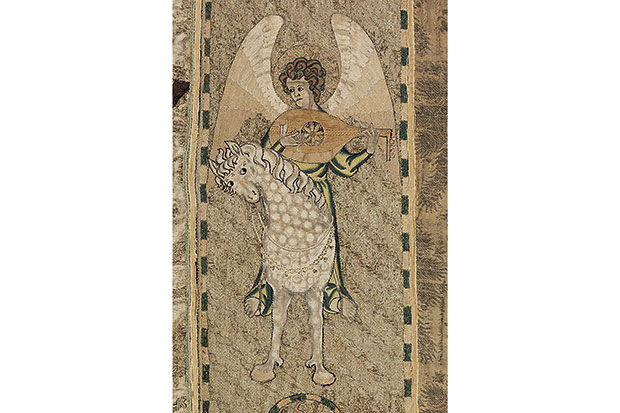 The last exhibition of Opus Anglicanum was 50 years ago; now the V&A is giving this generation an opportunity to see for itself pieces that have been assembled from around Europe from the 12th to the 16th century — though the catalogue observes that Anglo-Saxon embroidery was hot too. It’s a wonderful collection, mostly liturgical vestments — copes and chasubles that the priest or bishop would wear at mass — but including some secular pieces. What it should do is put embroidery in its proper place as an art form alongside stained glass, floor mosaic, painting and manuscript illustration, with which it shares exactly the same artistic form and imagery. There’s one lovely embroidered panel here of poor St Hippolytus being martyred which has grotesque figures at the top — animals with leering human heads — that are identical to those you find in the margins of manuscripts of the same period.