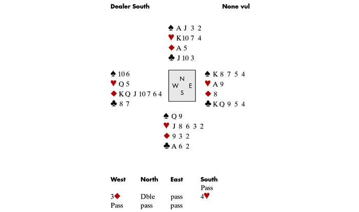 Hanlon made a take out double and Zia overbid (by his own admission) to 4♥. West led the ♦K. Zia won and produced some instant magic: he played a low spade. It was hard for East to hop up with the ♠K and return a spade; she ducked. The ♠Q won, and West petered with the ♠10 (perhaps not the wisest card). Zia now led a heart to his ♥10 and East’s ♥A. East exited with a trump. Zia won, played a low spade to the ♠9 and East was helpless: if she ducked Zia would lose just one club; if she won she was endplayed. Even if West had not petered with the ♠10 the contract would have made: instead of playing a low spade Zia would play dummy’s ♣J and duck East’s ♣Q to endplay her.