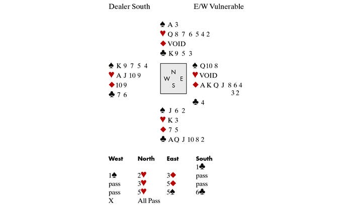 Meanwhile, in the open room my partner, sitting East, leapt to 6♦ in a much shorter auction, after I had overcalled 1♠ and North jumped to 4♥.This received the opening lead from South of the ♥King, and scored a miraculous 1370 + honours! When the dust settled we had won 2,660 points on one hand — and are through to the next round!