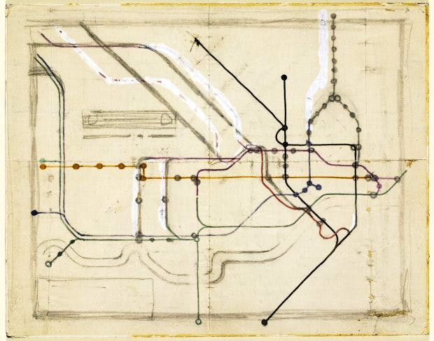 Harry Beck was the London Transport engineering draftsman who created the modern Tube map. With great art he decided to use only verticals, horizontals and diagonals while, for clarity, he greatly enlarged the city’s central area. The result is an all-time, trumpets-of-Jericho classic of graphic design, admired and copied everywhere.