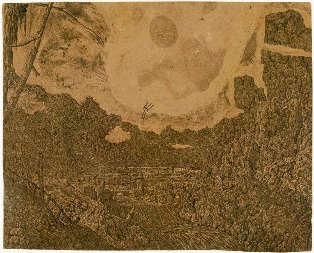 Necessity was sometimes the mother of his inventions, as when he printed on the marital bed sheets, to the horror of his wife. But it was his artistic vision that was truly revolutionary: his fantasy landscapes of crumbling crags and wrinkled lava flows are simply not of this world. Where did they spring from? Their corrugated contours seem to mimic the structures of corals, shells and sponges that he may have seen in contemporary cabinets of curiosity. Some look like rubbings, prefiguring the frottage drawings of Max Ernst — probably no coincidence, as the prints so little valued by Segers’s contemporaries that they were used for wrapping butter and soap would become all the rage among the surrealists.