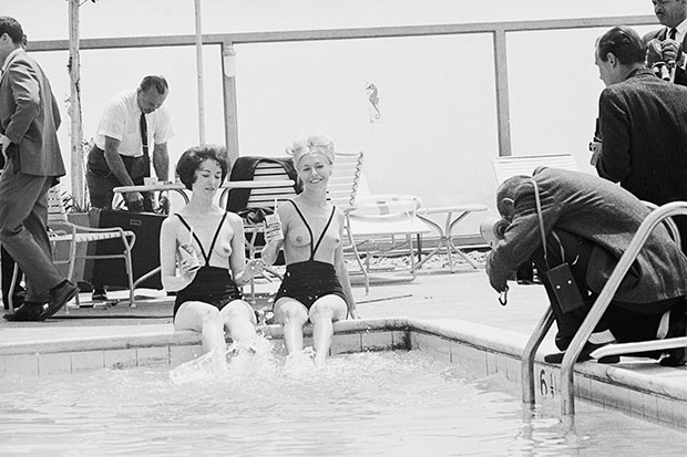 There are a trio, if indeed you can see them in the murk, of peasant dresses from the Auvergne, refreshingly simple and perhaps the nearest thing to vulgar in its true sense of being ‘echt’, or grass-rooted. Advance a couple of centuries and Paco Rabanne’s cream minidress, couture’s antithesis of vulgar, stripped down much farther than Chanel ever dreamed of, is in the same galère, and a bit more shocking in its simplicity than any of the fantasy frou-frou that the next wave of designers indulged in. And I was pleased that my dear friend Rudi Gernreich, astonishingly one of only two Americans included — the other being Charles James, whose witty Snow White-print dress long predates the Warhol-stolen Campbell’s Soup stuff — is represented by the very same tweed ‘big pants’, with nothing but narrow ribbon braces, that I’d had photographed on Rudi’s muse and model, Peggy Claxton, for a spread in the US magazine I art-edited in the early 1960s. It was the first totally topless fashion photo ever printed.
