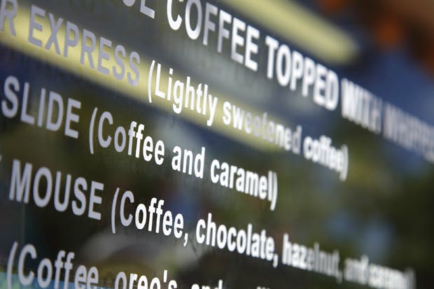 The man in front of me was ordering something like, from memory: ‘One regular black Americano with one and a half shots; one regular decaff white Americano with one shot, skimmed milk; a grande caramel full fat latte with two shots and extra froth; a regular soya cappuccino with one shot and chocolate on top, a large cappuccino with one and a half shots, skimmed normal milk and no chocolate; a large soya latte with two shots, easy on the froth; a macchiato with two shots and extra foam; and a small decaff mocha, normal milk, half a shot, no chocolate, extra cream.’