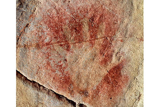 All those claims by different Greek communities, and even the ancient Egyptians, were wide of the mark. We now know that painting was some 30,000 years old at the date that Pliny was writing, and probably much older. The idea that painting began with a shadow, however, turns out to have some truth in it. At any rate, some of the images in the cave at Chauvet-Pont d’Arc, in the Ardèche region of France, and at other prehistoric sites, are a sort of stencil — akin to a shadow because it is simply an outline, a negative formed by the absence of paint — made by blowing pigment around the outstretched hand of the artist. Consequently, we know something about the man who made them: he was quite tall and had a bent little finger. In a way, this is the first signed picture.