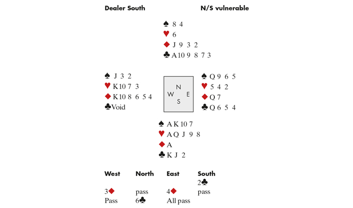 Price led ♦6, which I won perforce with the Ace. I played ♥Ace and ruffed a Heart, ruffed a diamond in hand, cashed Ace King of Spades and ruffed a Spade. Thoroughly enjoying the cross ruff theme, I ruffed a diamond with the ♣Jack, a Heart with the ♣Ace, a diamond with the ♣King and with 10 9 8 of Clubs left in dummy I could only lose one trick to the ♣Q. No finesse necessary — or taken! As usual the whole contract was in the bidding and Artur was the only one to bid slam — as he was quick to remind me when, glowing with pride at making the slam, he told me it was laydown and even I couldn’t go off. Sigh…