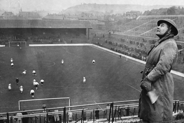 Luckily, wartime football soon picked up again. Late in May 1940, as the British Expeditionary Force appeared trapped near Dunkirk; as Harold Nicholson, parliamentary secretary at the Ministry of Information, said that shortly ‘the Germans may land thousands of men in Britain’ and the War Cabinet debated making peace with Hitler — at this time Huddersfield made a nine-hour motor trip to London to play a match in the War Cup. Then, while the armada of little boats was rescuing the BEF, a Chelsea-West Ham game drew 32,797 spectators in London. The racing correspondent of the Daily Mail reported after the fall of France, ‘The people were stunned by the news just after the first race at Wolverhampton yesterday but, of course, carried on and presumably the meeting today will go through, if only as a gesture of stoutness.’ (The crucial phrase in this sentence is ‘of course’.)