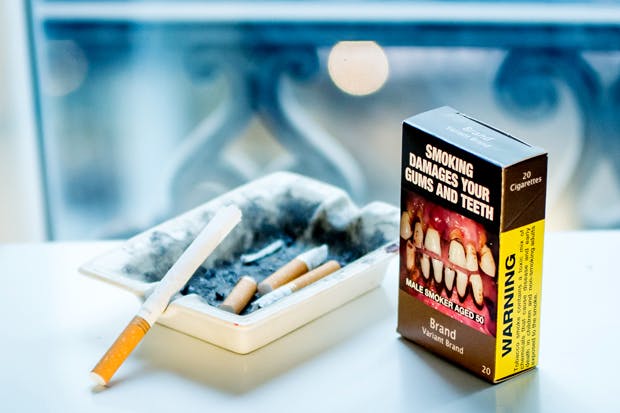 But that’s not where the fun comes in. The fun is in the photographs which now by law must adorn each carton and are the only immediately distinguishing feature of each packet. Photographs of people who have been really messed up by smoking (even if a good few of the hilariously gruesome images were not occasioned by tobacco at all, and are basically a lie). I’ve started playing Nicotine Poker with a bunch of friends who smoke and so am amassing a large number of empty cartons. A royal flush is five packets which depict a woman hawking up blood into a handkerchief. Very difficult to collect. Or there’s a full house — three of the Asian man with rotting gums, plus two tracheostomies. Or two limp penises and a trio of diseased lungs.