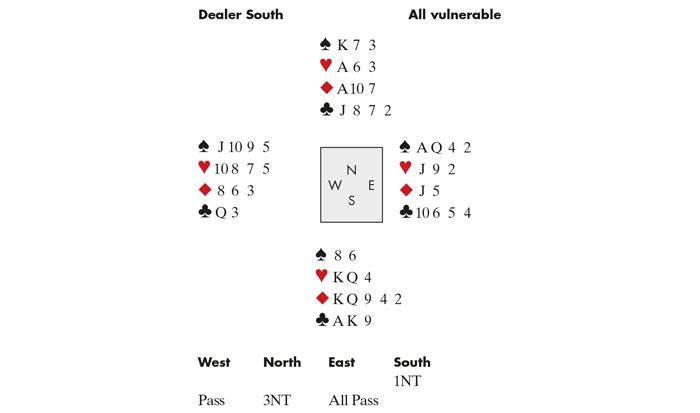 Both tables reached the normal 3NT, one from North, who wrapped up 12 tricks on a Spade lead, and the other from South — after a heavy 15–17 opening. South received the lead of the ♠Jack. He ducked the first round, but the continuation of the ♠10 was covered by the King and Ace. East also cashed his Queen of Spades, but then shifted to a Club!