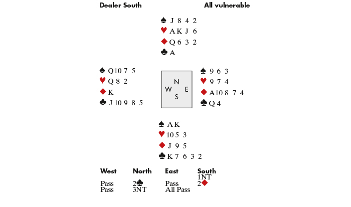 Christophe was West, and led the ♣Jack, East unblocking the ♣Queen under dummy’s Ace. South started brightly with a Diamond to his nine, West winning the King and continuing Clubs. Declarer threw a Spade from dummy, won the trick with his King and tried a Heart to the Jack. This went well, as did another Diamond from dummy to his Jack, bringing his visible total tricks up to eight. Now South played a second Heart, and if Christophe had followed low, declarer would have had an easy nine tricks after the suit proved to be 3-3, but he did not follow low. He followed with the ♥Q!