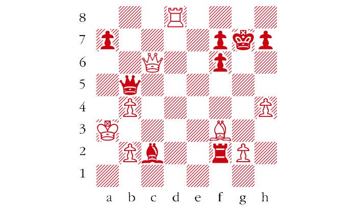 Black to play. This position is from Topalov-Anand, London Classic 2016. How did Black conclude? Answers to me at The Spectator by Tuesday 17 January or via email to victoria@-spectator.co.uk. There is a prize of £20 for the first correct answer out of a hat. Please include a postal address and allow six weeks for prize delivery.