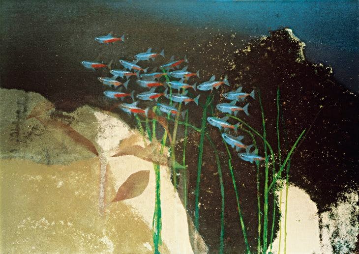 He painted Scottish moors, where amazingly enough he loved to go deerstalking, and Ayers Rock in the Australian outback. Another series from the 1970s, dealing with the improbable subject of tropical fish, reveals Andrews as master of evoking the sensation of swimming, merging into a watery world of translucent reflections.
