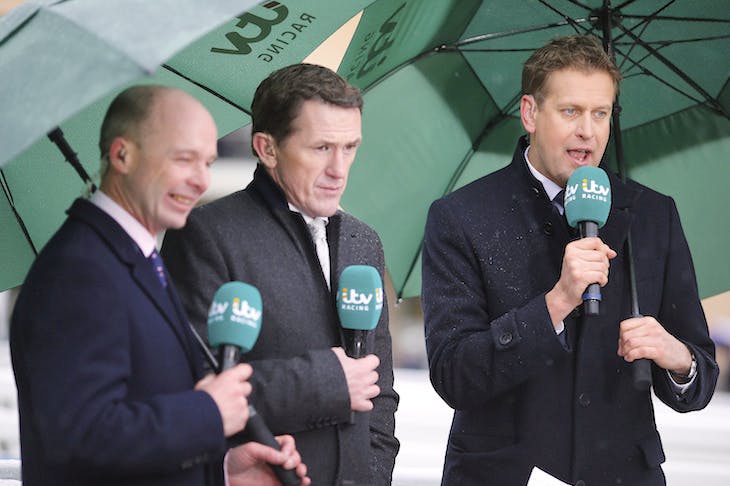 You had to feel for ITV’s new racing team on their opening day at Cheltenham. It was cold, wet and utterly miserable but they opted not to take refuge in a warm studio but to stay close to the action under their brollies, putting a brave face on things. During what I nowadays look back on as my misspent youth as BBC political editor, I once did the same. As I began a live interview for the Nine O’Clock News from an outside balcony at a Labour party conference, bursting to reveal some exclusive information, the heavens opened. I was drenched within 30 seconds but continued, only for the newscaster to cut me off after just one question with a brisk ‘Thank you, Robin Oakley in Brighton.’ Furious, I called the programme editor: ‘What the hell were you doing? This is a big story. I needed much more time.’ The reply was simple: ‘Absolutely no point, Robin. Even in the studio we were all watching nothing but the line of wet creeping down your shirt and the rivulets running off the end of your nose. No viewer will have been listening to a word you said.’ Broadcasting gremlins you learn to cope with, but none of us can do anything about the weather.