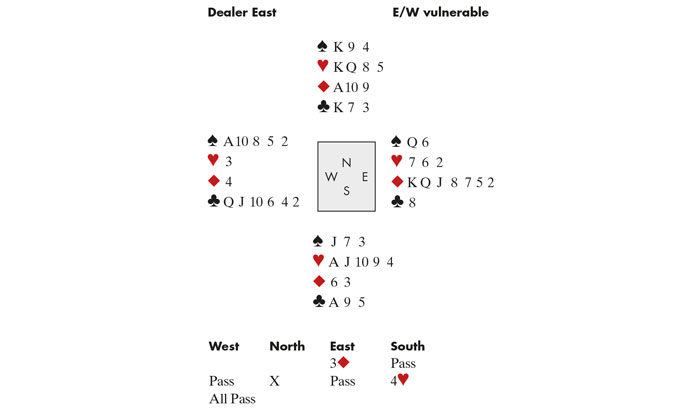 West led his singleton Diamond which Peter won with the Ace and drew trump in three rounds. At trick four he gave East a Diamond and ruffed the next one. Needing to find out East’s shape, Declarer played off King and Ace of Clubs, and when East showed out on the second round he was marked with a 2-3-7-1 hand. Now Peter played a Spade to dummy’s King and awaited East’s card: if he keeps the ♠Q, he will win the next round and have to give declarer a ruff and discard — so he unblocked his Queen. Peter now changed tack and exited with a Club — endplaying West who had to give Declarer a trick with the ♠Jack. Very neat indeed.
