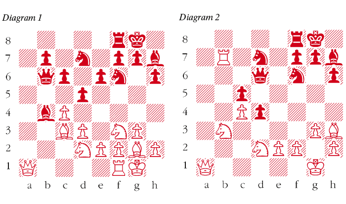 1 Nf3 d5 2 b3 Bf5 3 Bb2 e6 4 d3 h6 5 Nbd2 Nf6 6 c4 c6 7 g3 Be7 8 Bg2 0-0 9 0-0 Nbd7 10 a3 a5 11 Qb1 Bh7 This is a classic position from the Réti Opening. Indeed, the black formation was introduced by Emanuel Lasker in his game as Black against Réti himself at New York 1924, the tournament where Réti’s Opening truly hit the headlines. 12 b4 axb4 13 axb4 Qb6 14 Bc3 Rxa1 15 Qxa1 Bxb4 (see diagram 1) White can sacrifice his b-pawn with impunity, since he will easily regain it and invade the black camp with his rook. The strategic point of White’s play is to try, as far as possible, to restrict the activity of Black’s bishop on h7. 16 Bxb4 Qxb4 17 Rb1 Qd6 18 Rxb7 e5 19 d4 In the light of my previous comment this thrust might seem odd. However, although Black’s bishop has now been apparently liberated it is biting on thin air. Its pseudo-activity is more than compensated by White’s increased mobility. 19 … exd4 20 Nxd4 c5 21 N4b3 d4 22 Bh3 (see diagram 2) 22 … d3 Apparently powerful but after White’s reply, the black bishop is once again biting on granite. 23 e3 Ne5 The best chance was 23 … Rb8 to reduce White’s attacking units. 24 Bg2 Rc8 25 f4 Neg4 26 e4 Black’s pieces have found themselves in a terrible tangle and White now wins material. 26 … Re8 27 e5 Nxe5 28 fxe5 Rxe5 29 Rb6 Qe7 30 Rb8+ Ne8 31 Bc6 White deals with Black’s threats by ignoring them. The following transaction leaves Black hopelessly behind on material. 31 … Re1+ 32 Qxe1 Qxe1+ 33 Nf1 Black resigns