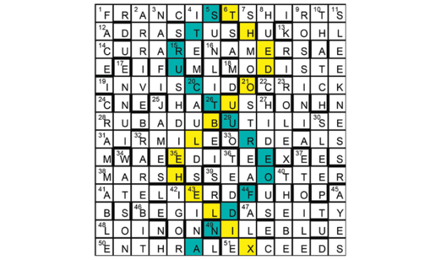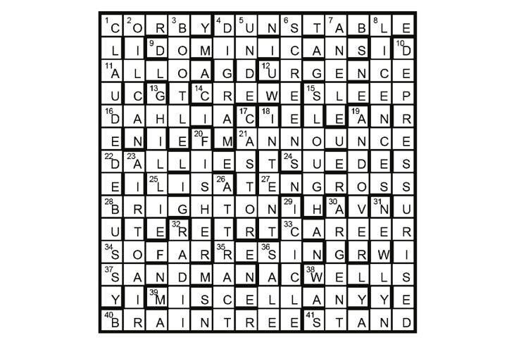 The HEADWORD (26) ‘bail’ appears six times in CHAMBERS (1D). Its different meanings include CROSSPIECE (1A), BAR (25), FRAME (36), HOOP (40), LADLE (16) and SECURITY (24). BAIL (diagonally from 32) was to be shaded.