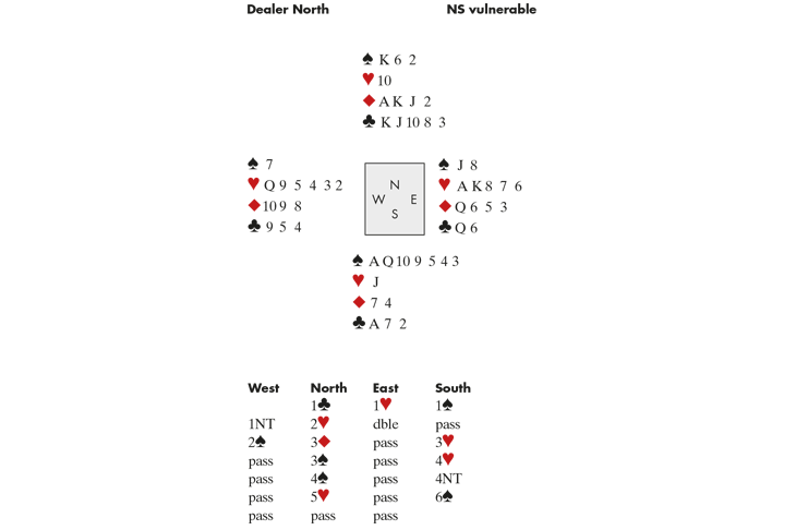 John Carroll felt that showing his heart fit would only encourage his opponents to keep bidding, so he decided to bid a psychic 1NT. But Forrester had enough to show a good raise in spades via a heart cue bid. A few seconds later, Carroll tried a second psyche of 2♠. But N/S were undeterred and bid on to slam (3♥ was a game-force; 4♥ a cue bid). 6♠ would have been tricky on a heart lead, but Carroll kicked off with a diamond. Bakhshi (S) won the ace, played a spade to his queen, then a diamond to the king followed by a diamond ruff. A spade to the king put him back in dummy to ruff the last diamond and now he exited with a heart, forcing the defence to solve his club guess for him.