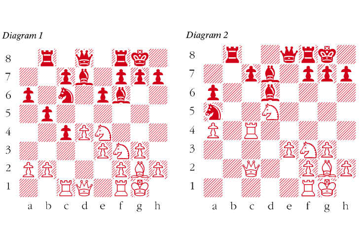 1 Nf3 d5 2 c4 e6 3 d4 Nf6 4 g3 dxc4 5 Bg2 a6 6 0-0 Nc6 7 Bg5 Other moves for White leading to a sharp game are 7 Nc3 and 7 e3. 7 … Be7 8 e3 Bd7 9 Nc3 0-0 10 Rc1 Rb8 At first glance it looks like Black is doing well as he is ready to support his extra pawn with … b7-b5. The way Grischuk gains control of the position will therefore come as a surprise to those not acquainted with this type of pawn structure. 11 Bxf6 Bxf6 12 Ne4 b5 (see diagram 1) Black holds on to his pawn, but now Grischuk’s plan is revealed. 13 b3 White is going to attack everywhere: on the queenside, in the centre and on the kingside. 13 … Be7 14 bxc4 bxc4 15 Rxc4 Nb4 16 a4 Qe8 17 Nc3 Nc6 Black goes passive at the wrong moment. He should have persevered with his attack on a4 with 17 … Nd5. Then after 18 Nxd5 exd5 19 Rxc7 Bd6 20 Ra7 Bxa4 21 Qa1 Rb6 22 Ne5 an unbalanced situation arises. White is attacking d5 and has the initiative in the centre, but Black’s bishop-pair shouldn’t be underestimated. 18 d5 exd5 Black can’t prevent a white knight taking up a commanding centre position, as if 18 … Nb4 19 Ne5! follows. 19 Nxd5 Bd6 20 Qc2 Na5 (see diagram 2) 21 Rh4 It is very logical for White to switch to a direct kingside attack, as Black’s three minor pieces, especially the knight, are a long way off and his queen isn’t well positioned for the defence either. 21 … h6 Black has no good way to shield h7. For example, 21 … g6 loses the queen to a fork on f6, while if 21 … f5 22 Qc3 gaining time to set up a winning sequence by attacking the black knight, e.g. 22 … Nc6 23 Ng5 h6 24 Nxc7! Bxc7 25 Bd5+ Kh8 26 Rxh6 mate. 22 Rxh6 Exploiting the potential fork on f6. Black’s position is falling apart all over the board. His king’s defences are full of holes and his pawns and pieces are mostly hanging. 22 … f5 23 Rh4 Nb3 24 Nxc7 Qe7 25 Ng5 The most energetic way to finish the game is to clear the way for the Catalan bishop to join in the attack. 25 … Qxg5 26 Bd5+ Rf7 27 Qc4 Rbf8 28 Qxb3 Bxc7 29 Rd1 More accurate was 29 Bxf7+ Rxf7 30 Rh8+ Kxh8 31 Qxf7 when Black loses a bishop, leaving him far too much material down – 31 … Qd8 32 Rd1 wouldn’t help him. 29 … Be8 30 Qc4 Be5 31 f4 Qe7 32 fxe5 Qxe5 33 Qd4 Qe7 34 Rf4 g6 35 e4 Black resigns