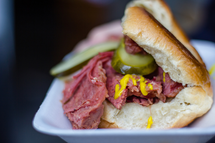 Inside, it is a faded yet glittering cavern, stretching towards yet more neon signs that say Katz’s, and photo-graphs of celebrities eating, or recovering from eating, salt beef. The atmosphere is chaotic, for who can ease themselves into Jewish culture? And so there is an air of madness here; of forcing yourself into something — or something into you, in this case salt beef — before it ends. Half the queue surges for table service, which feels wrong, because it requires patience and there is none here; the other half queues again, at a long counter above which is a map of the United States of America in neon, and the famous contribution of Katz’s to the liberation of Europe, or the colonisation by Jews of the Middle East, depending on your politics: ‘Send a salami to your boy in the army’.